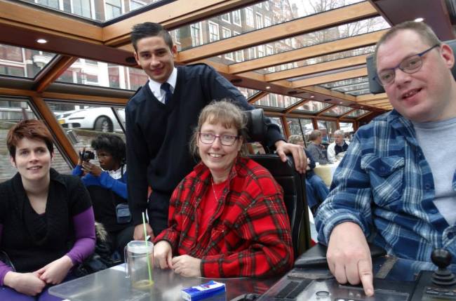 Om meer ervaring op te doen met de omgang van gasten aan boord, mocht ik met acht medestudenten een heel speciale rondvaart begeleiden. Aan boord kwam een groep jongeren van de Amsterdamse Zonnebloem. De meesten van hen zaten in een rolstoel. Daarom voeren we met een boot met achterop een lift, zodat in- en uitstappen ook voor hen geen probleem was.
