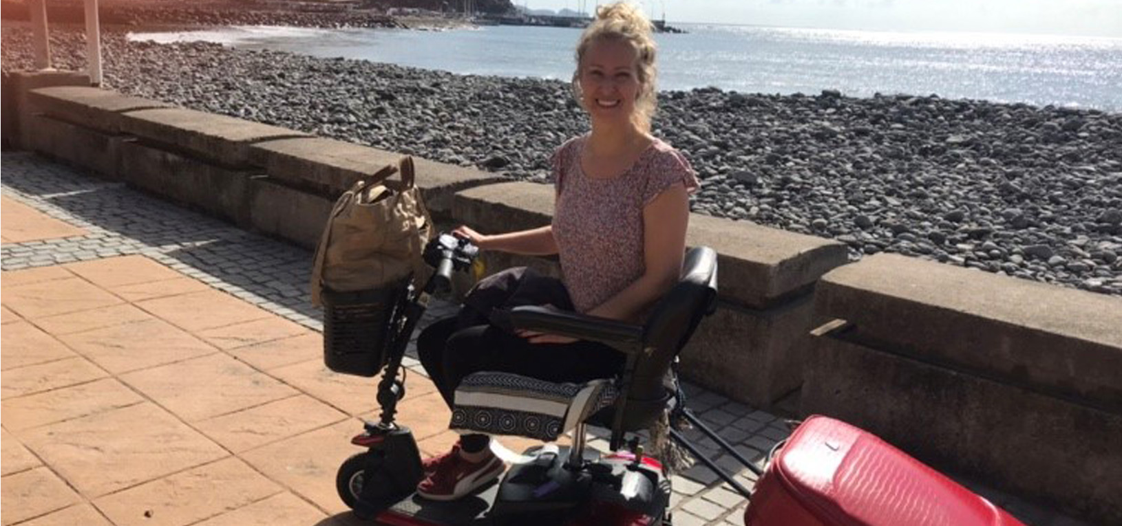 Ik zie een uitgestrekt goudgeel zandstrand. Rotsen en kliffen in de verte. De eindeloos lijkende glinsterende zee. De hemel staat strak blauw. En de zon geeft een heerlijke temperatuur van 22 graden. Parasols met palmbladeren wapperen mee in de zachte lucht. Het meest fantastische van alles, op dit magische strand van Porto Santa (Portugal), ben ik (bijna) helemaal alleen. Rust, stilte, de zee, het strand en ik. Sinds jaren ben ik alleen op vakantie. Koffer met een spin achter mijn karretje gebonden, hop alles is mogelijk. Een weekje bijtanken. Het mindervalide raken, samenwonen, moeder worden, verhuizen, eist zijn tol. Ik boek een vakantie waarbij ik helemaal in de watten word gelegd. Vier massages per dag. Een spa met verwarmde baden waar mijn spieren kunnen ontspannen. Maar gek genoeg is dat niet hetgeen waardoor ik tot rust kom. Op dat moment realiseer ik mij dat ontspanning er nu anders uitziet dan voorheen. Ik ben zo blij als een kind als ik mijn hotelkamer inrijdt. Alles is ruim opgezet en op de juiste hoogte. Zelfs het ligbad kan ik vanuit mijn scootmobiel zo instappen. Het restaurant is heel toegankelijk en ik hoef even niet te denken aan de boodschappen, luiers, fruithapjes, brood of melk. Vóór mijn wenken word ik al bediend. Vanuit mijn kamer in het hotel gaat de lift naar de kelder, waarbij er grote en brede gangen zijn aangelegd onder het hotel door. De tunnels leiden direct naar het strand, zwembad of de spa. Zonder een drukke weg over te steken met drempels en hoge stoepranden kom ik overal. Zelfs op het strand zijn speciale rolstoelen. Ik hoef maar naar Gustav te roepen en enthousiast kletsend rijdt hij mij naar het water. Ik kan even los zijn. En mijn eigen weg gaan.