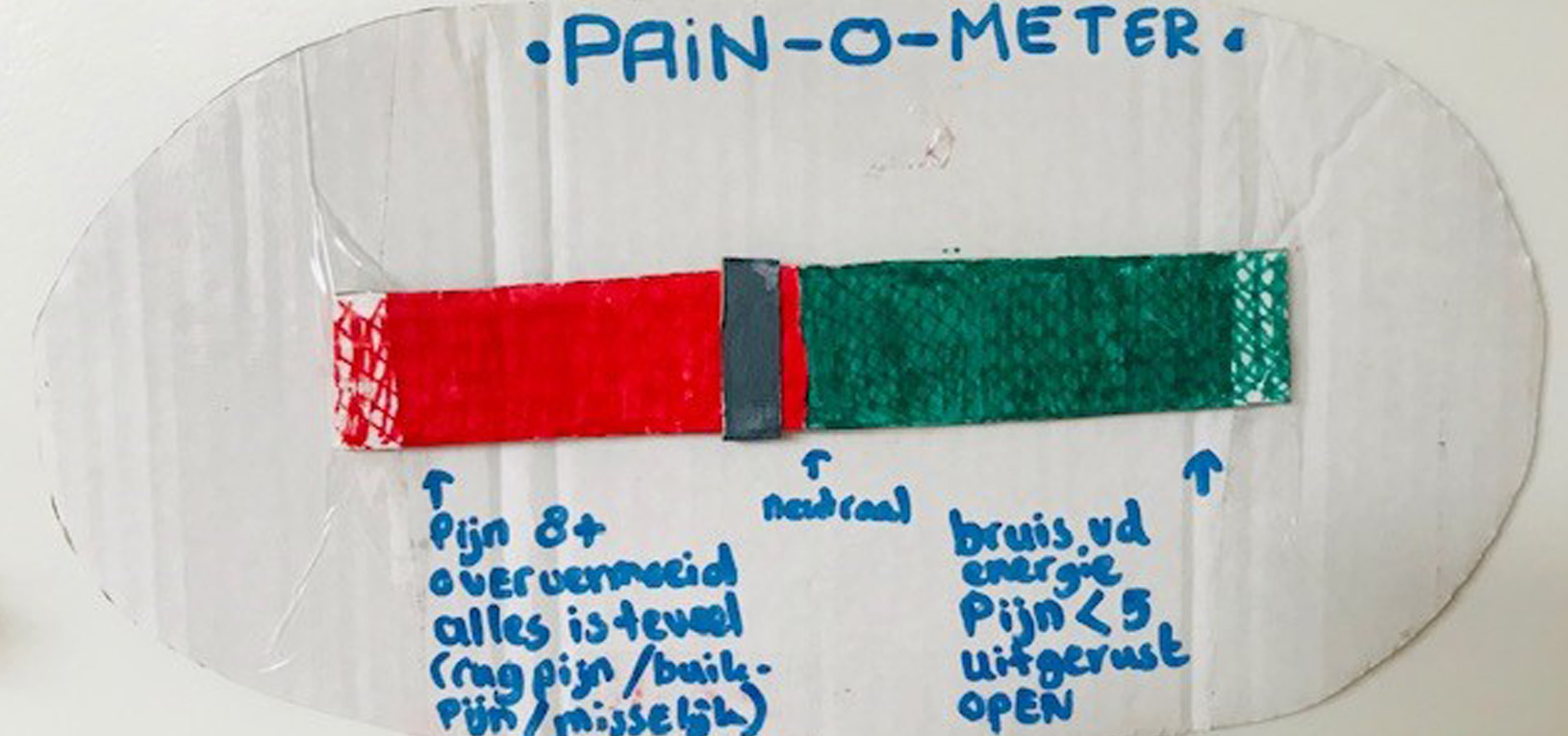Mijn vriend legt liefdevol zijn hand op mijn rug en vraagt of ik vandaag veel pijn heb. Na heel veel praten over pijn, een onderwerp dat wij beiden meer dan zat zijn, voel ik mij naïef teleurgesteld dat hij niet in mijn hoofd kan kijken. Daarom maakt hij een pijn-o-meter. Met een schuifje kan ik laten zien waar ik op de pijnschaal zit. Meer betrokken vind je ze niet. Wat een man! Ik schater het uit als hij de meter ophangt. Het brengt ons een enorm inzicht. Voor hem in mijn pijn. Voor mij in mijn stemming. En bovenal in mijn communicatievermogens. Nu kan ik in ieder geval zeggen: “ik kan niet praten nu, wacht even tot-dat ik zit.” Of hij vraagt überhaupt niks als hij ziet dat ik ver in het rood zit.