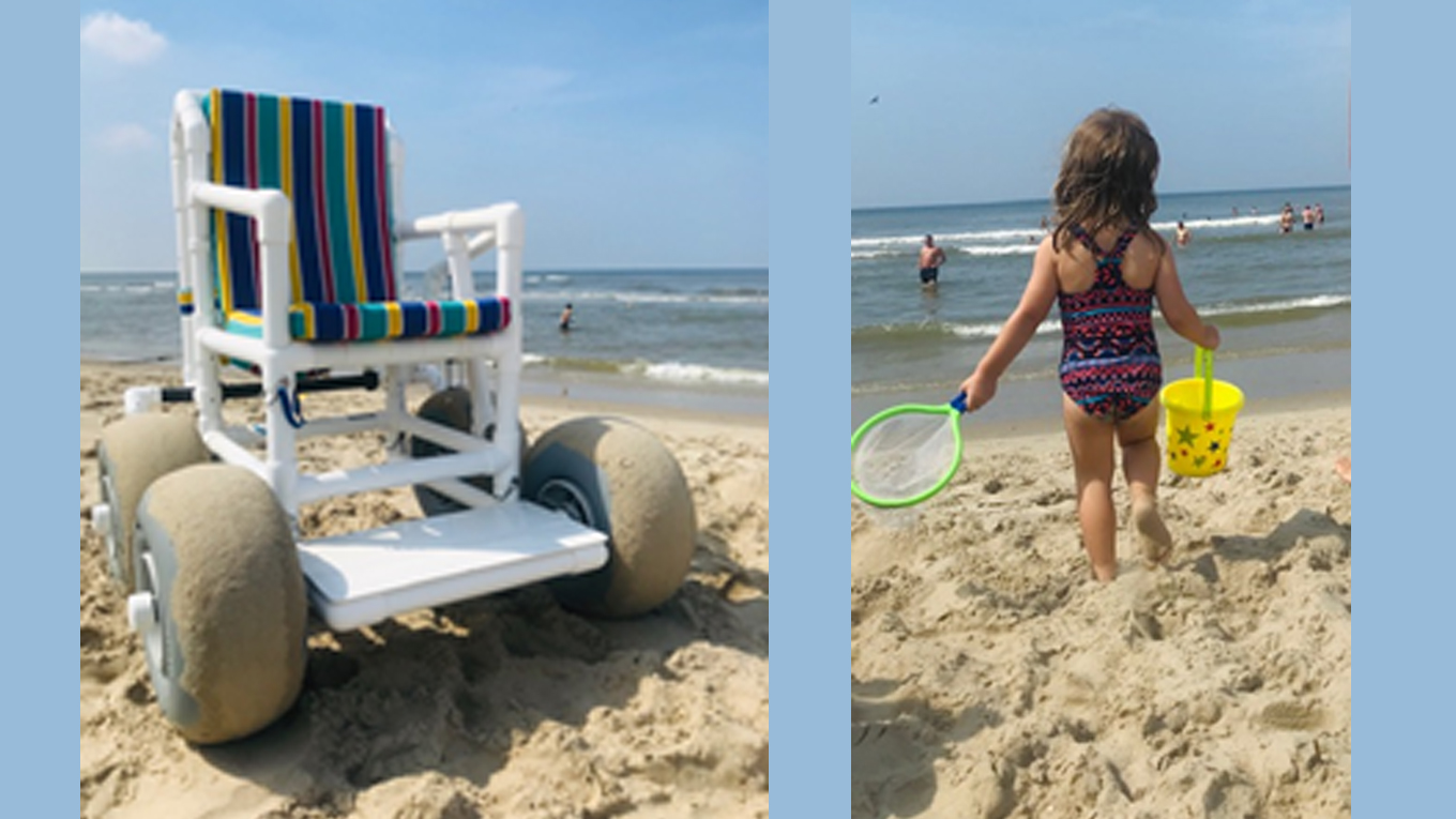 Vandaag waren we een dagje op bezoek bij opa en oma op vakantie aan zee. Met een soort uitvergrote playmobile rolstoel word ik met Rosie op schoot zo naar de schelpen en de schuimkoppen geduwd. Wat een heerlijke dag! We genieten van de zee, het mooie weer en elkaar. Ik zie gelijk drie andere mensen in een rolstoel op het strand. Zoiets zit toch in je systeem. Met veel interesse kijk ik vooral naar de wielen. Want ik raak steeds meer thuis in de wereld van rolstoelen. Met dikke jaloezie zie ik een man met speciale strandwielen: vet! Die wil ik ook wel.