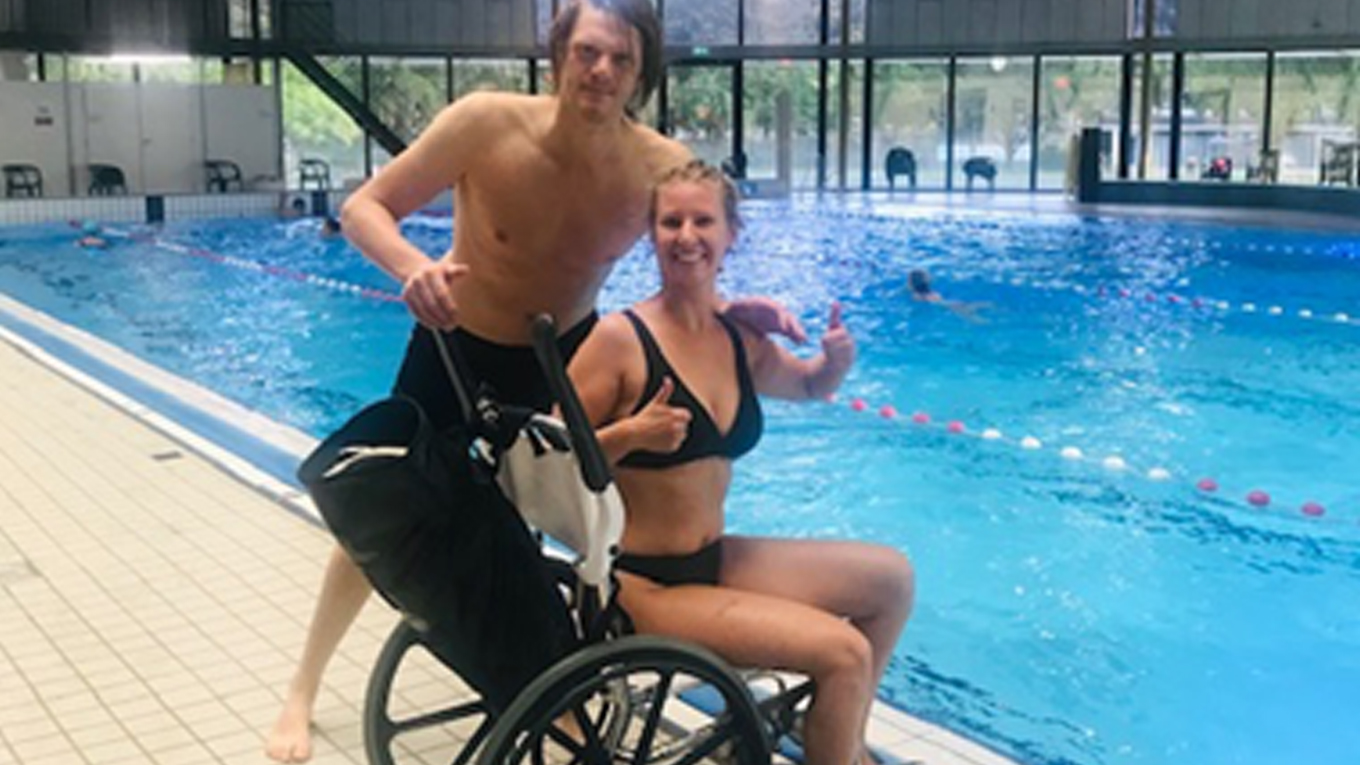 Een goede vriendin van mij werkt als kinderfysio op een boerderij met paarden. Zou er ook een soort van bijzondere fysio zijn voor volwassenen? Ik google mij suf. En kom ineens uit bij fysio in het water. Natuurlijk! Ik houd enorm van zwemmen en dat lijkt mij wel geschikt. Soms trek ik baantjes in het zwembad maar ik vind dat best zwaar. ‘Ik zou zo graag weer lekker willen zwemmen.’ Zeg ik als we in de tuin zitten bij mijn schoonouders met mijn zwager en schoonzus. Maar ja de zwembaden waren (toen) dicht. En buiten is het te koud. ‘Oh ik heb een wetsuit over!’ Roept mijn lieve schoonzus. Ze komt aangelopen met een mooi pak. ‘En kleed ook nog eens heel goed af deze.’ (niets kleed af met een mama-rolstoelbuikje kan ik inmiddels concluderen, haha). Maar gepast en wel besluit ik in de Amstel te springen. Zo alleen met mijn scootmobiel aan de kant en in het koude water (11 graden) vind ik het toch wel een sprong. Ik besluit een oproepje te plaatsen bij Amsterdam durft te vragen op Facebook. Honderden reacties stromen binnen van aardige Amsterdammers die mij wel een handje willen helpen en mee willen zwemmen. De kou heb ik onderschat. We hebben maar 15 minuten in het water gelegen. Alles moest wennen. Zeker omdat ik ook nog altijd veel pijn heb was dit wel een erg grote opgave. Maar wat me wel duidelijk wordt: ik wil gaan zwemmen. En ik heb een nieuwe fysio nodig. Er bestaat fysio in een (verwarmd) therapiebad. Klonk heerlijk na mijn onderkoelde avontuur in de Amstel. Na de kennismaking volgt de eerste training. Het is fijn maar ook niet helemaal wat ik zoek. Eigenlijk doe je vooral oefeningen in het water. En waar ik zo van houd is juist die baantjes trekken. Sporten. Trainen. Aaaaah, waarom is het zo moeilijk hierin mijn weg te vinden?