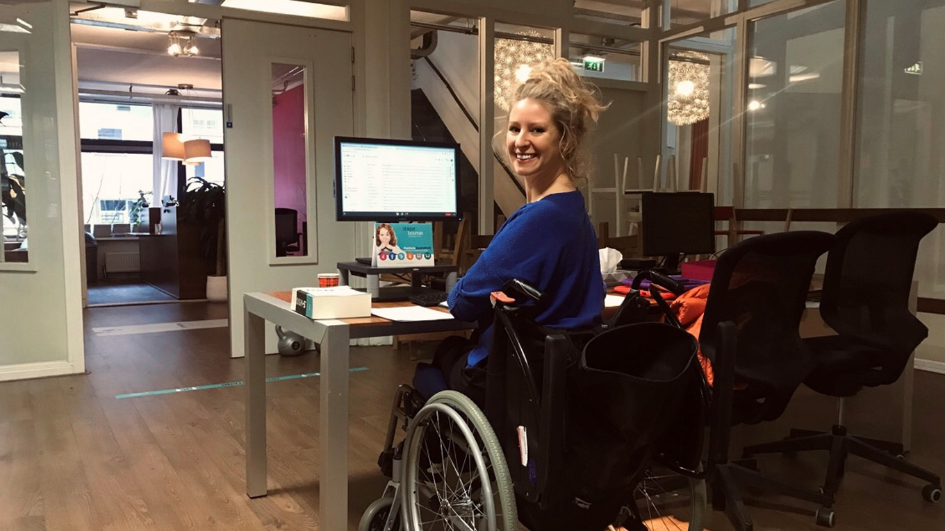 Het is één van mijn eerste werkdagen. En wat een verschil ervaar ik nu al. Ik zit inmiddels al 4 jaar thuis in de ziektewet. Ik ben orthopedagoge van beroep en dol op mijn vak. Alleen hoe vind je een geschikte werkplek? En hoe houdt je een balans met de pijnklachten en vermoeidheid? Ik had een aantal organisaties op het oog die mij interessant leken. Maar ja, kan ik zomaar solliciteren vanuit deze positie? Ik zal toch rustig in uren en taken moeten opbouwen. Ik besloot daarom maar een heel open mail te sturen met een fotootje van mij en Rosie in de scootmobiel erbij. Zo van: dit ben ik. Dit is mijn situatie. Dit heb ik te bieden en dit heb ik nodig. Bij Dokter Bosman in Amsterdam word ik uitgenodigd voor een online kennismakingsgesprek. Spannend! Want in deze corona-tijd komt haast niemand aan een baan. En ik heb al in geen eeuwigheid meer gesolliciteerd. Er volgt een goed en interessant gesprek. Eigenlijk is het vanaf toen heel snel gegaan en ben ik nu twee ochtenden aan het werk op de poli in een fijne rolstoel die zij voor mij huren.