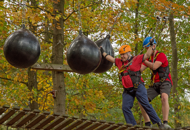 Aangekomen in het bos wil waaghals René beginnen. Terwijl hij vol zelfvertrouwen 5 meter omhoog getrokken wordt, kijken de andere deelnemers hem met open mond na. Wanneer de eerste hindernis genomen is, barst er een gejoel en applaus los. “Je bent een topper!” Zo klinkt het luidkeels. René steekt zijn armen in de lucht en geniet overduidelijk van dit avontuur. Enthousiast gaat hij verder met de andere hindernissen, om te eindigen bij de tokkelbaan. De andere deelnemers houden hun adem in: dit ziet er toch wel spannend uit. René daarentegen laat zich vol vertrouwen vastklikken. Vanuit een weelie gaat hij het platform af en suist 35 meter door het bos. Met een lach van oor tot oor komt hij teruggerold naar de groep.